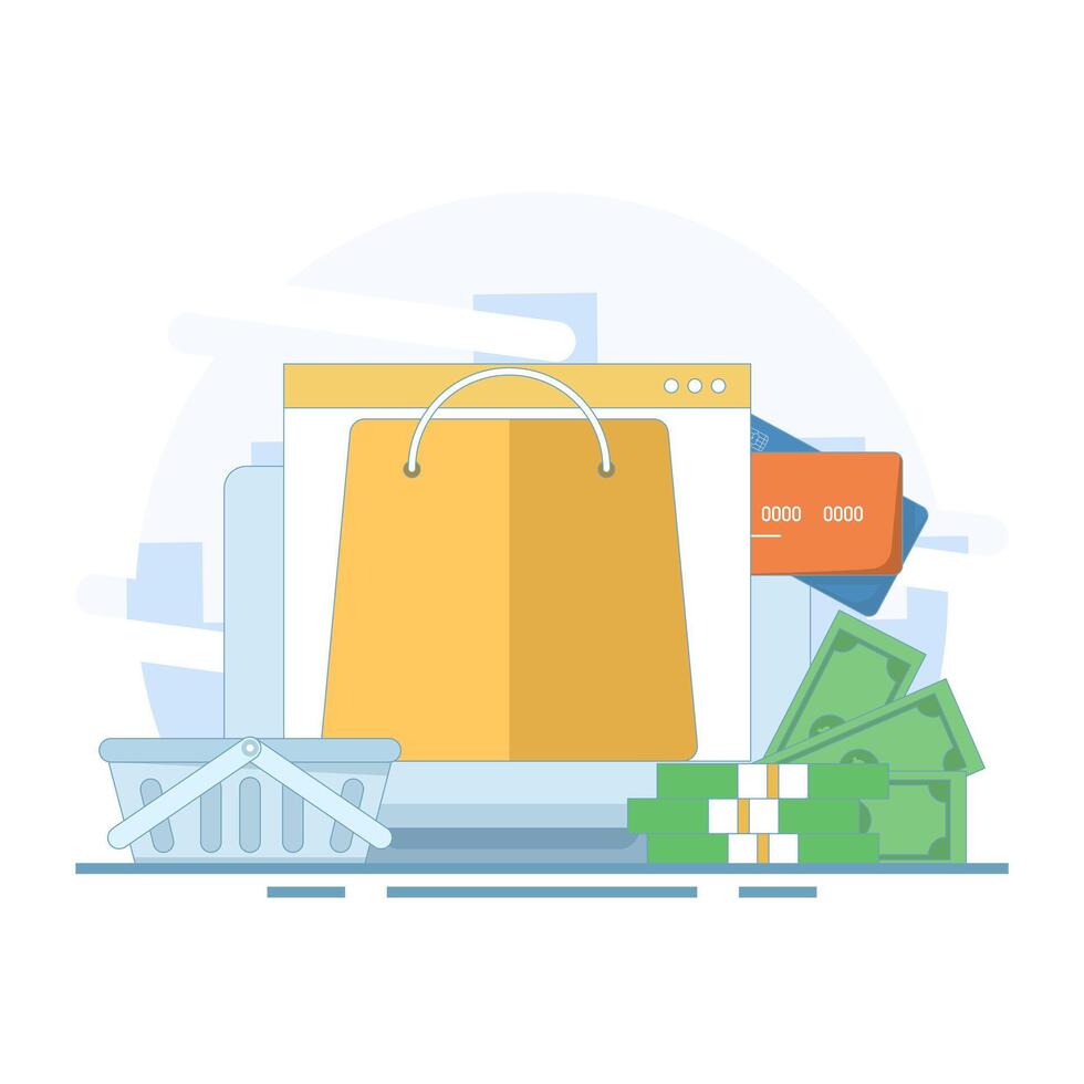 E-commerce concept. Computer and shopping bag are symbols of online shopping. E-commerce online shopping via mobile phone. Making purchases using mobile applications. Flat design illustration. Pro Vector
