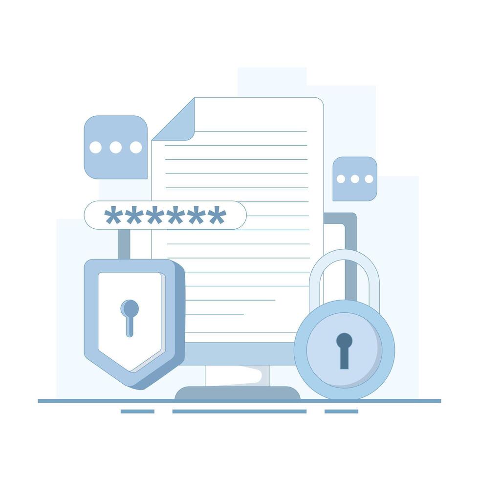 data protection concept, Documents are protected by password encryption technology, personal and business document security with password verification and encryption technology. flat design. Pro Vector
