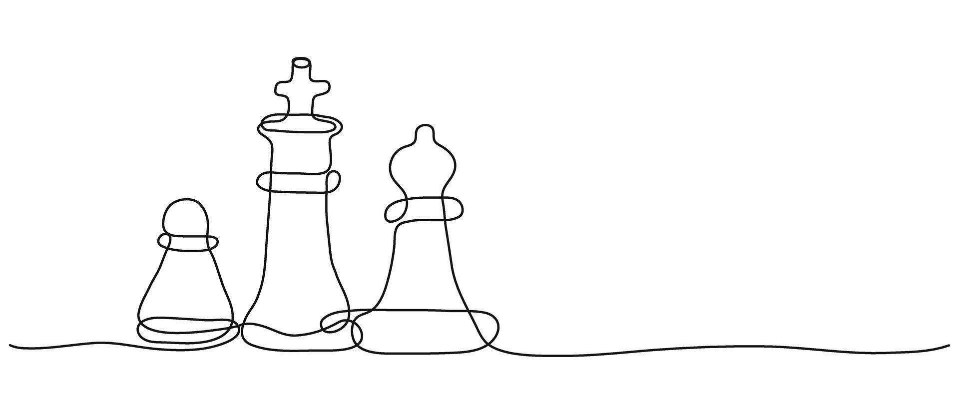Chess in continuous one line art style. Minimalist black drawing on white background with copy space. Hand drawn pawn rook and king with editable stroke. Outline game element. Pro Vector