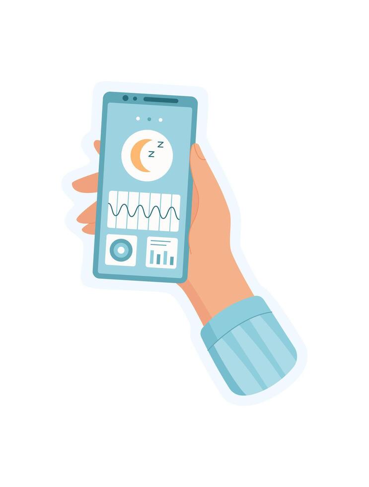 A hand holds a phone sticker. A mobile device displays a sleep app. Cool feature with touch screen, flat style, suitable for online media and communication service. Pro Vector