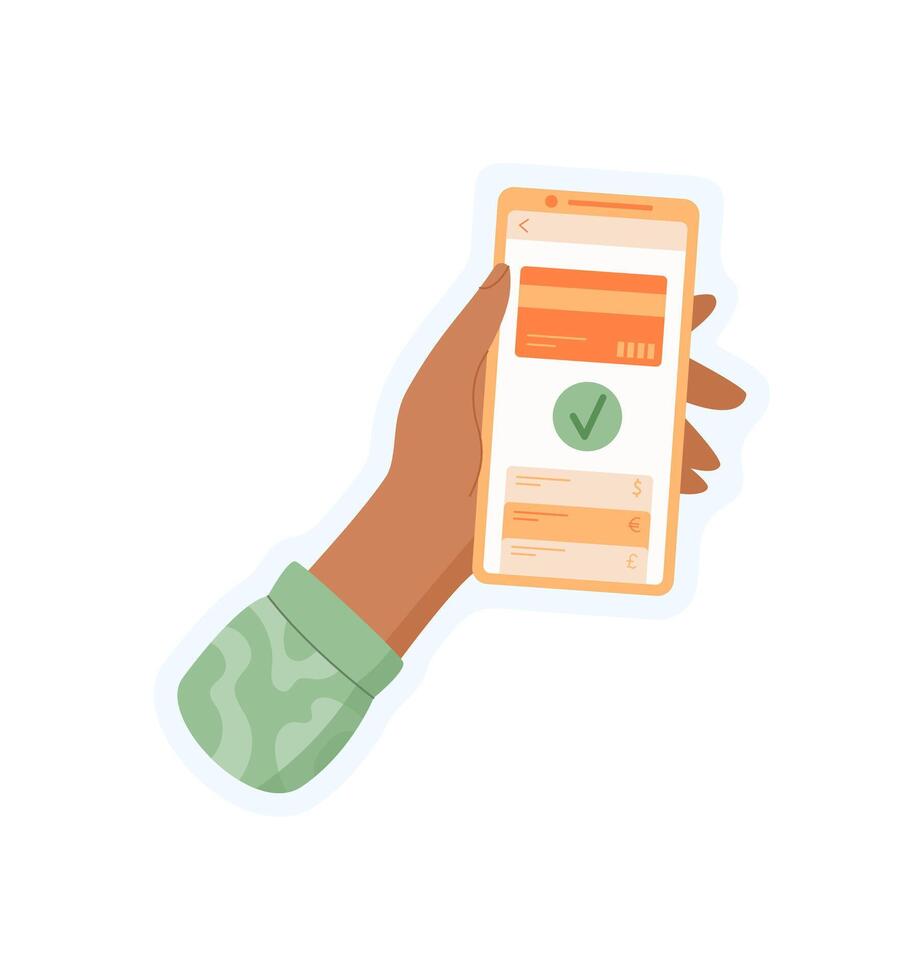 Hand holding smartphone sticker. User interacts with payment app on the screen. Character utilizing mobile technology in a flat style. Ideal for online shopping, business service, and social media Pro Vector