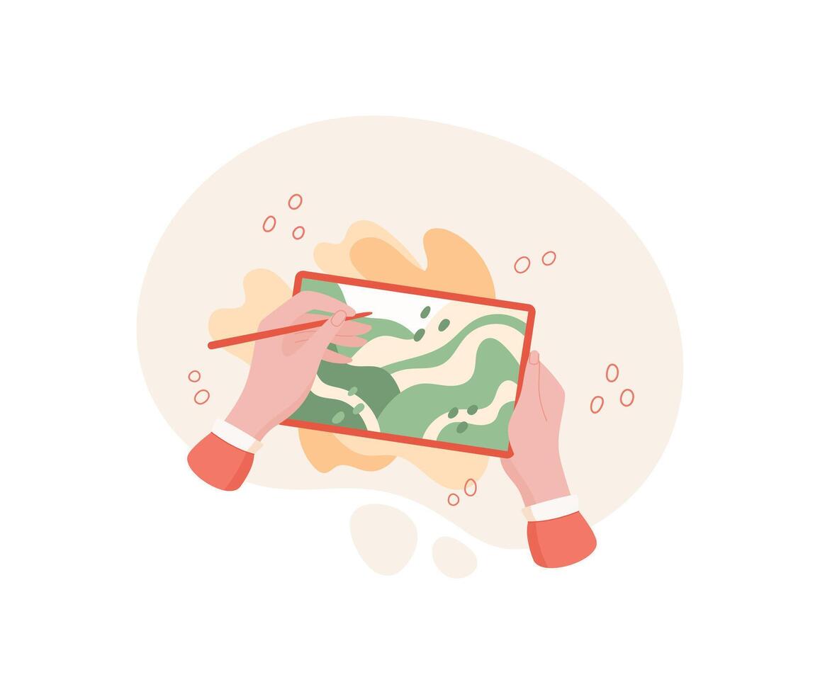 Hands hold a tablet while they draw simple art. A person uses a digital device for creating designs. This action illustrates creative concept, modern technology, and artistic expression. Pro Vector
