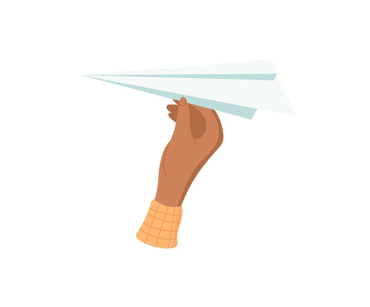 Hand holding airplane sticker. Gesture of a human character. Concept of creativity, flat design, potential usage in various graphic applications. Pro Vector