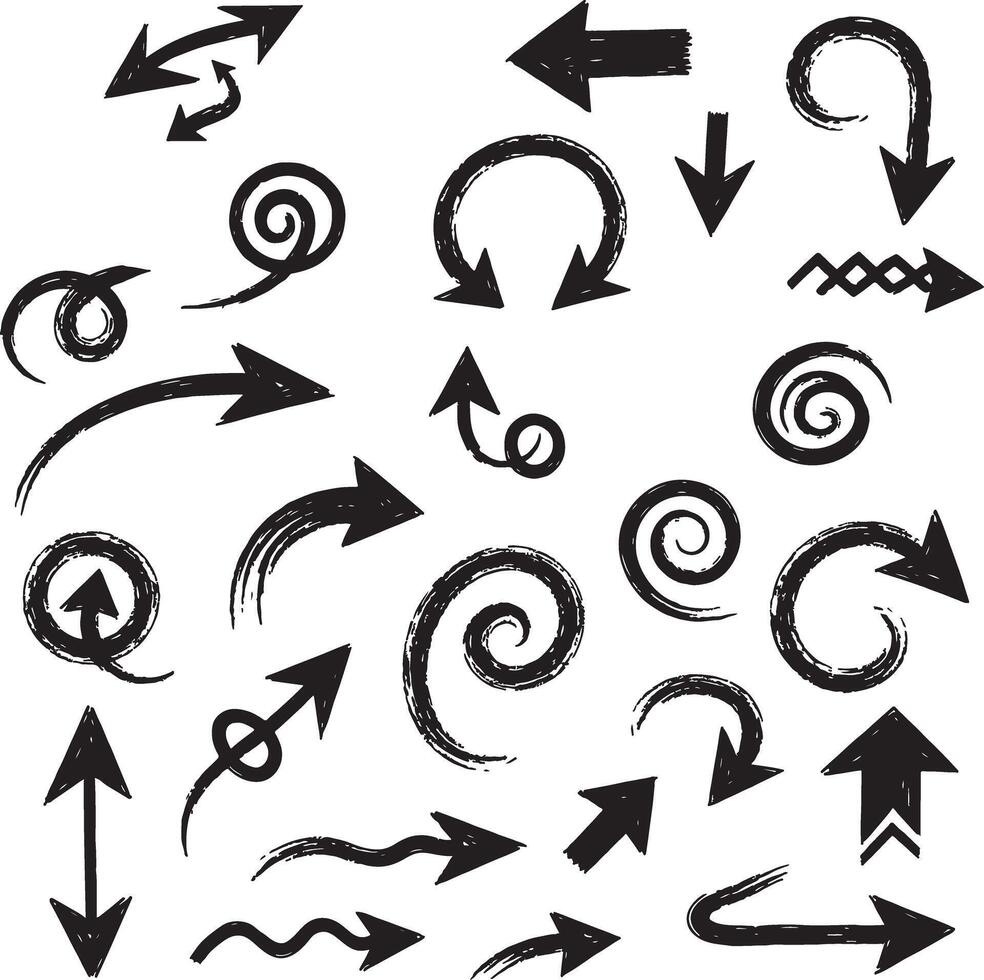 Scribble style arrow icon set with messy ink textures, curved motion symbols, bold hand drawn lines and abstract artistic direction signs for creative projects Pro Vector