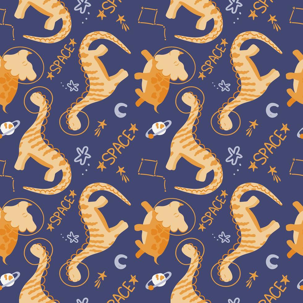 Seamless pattern with dinosaurs in space, drawn elements in a flat style. Handwritten inscription. Dinosaurs with planets on white background. Planets, stars and spaceships. Jurassic reptiles. Pro Vector
