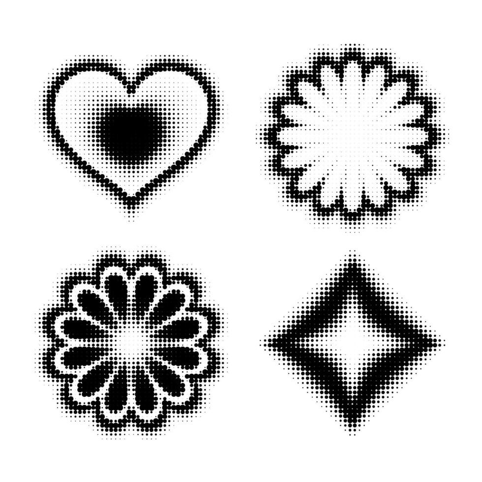 Halftone geometric icon set in black on a white background. Abstract shapes hearts, flowers, stars, with a retro pixelated dot pattern. Perfect for modern, minimal, and Y2K inspired designs. Pro Vector