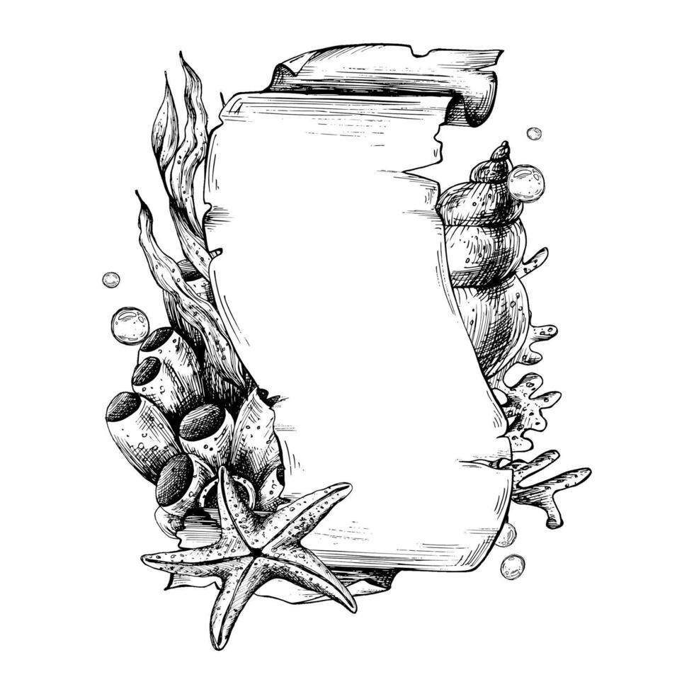 Papyrus rolled scroll with jagged edges, space for text with corals, shells, starfish, sea sponges, algae. Graphic illustration, hand drawn with black ink. Template, vertical frame, board EPS Pro Vector