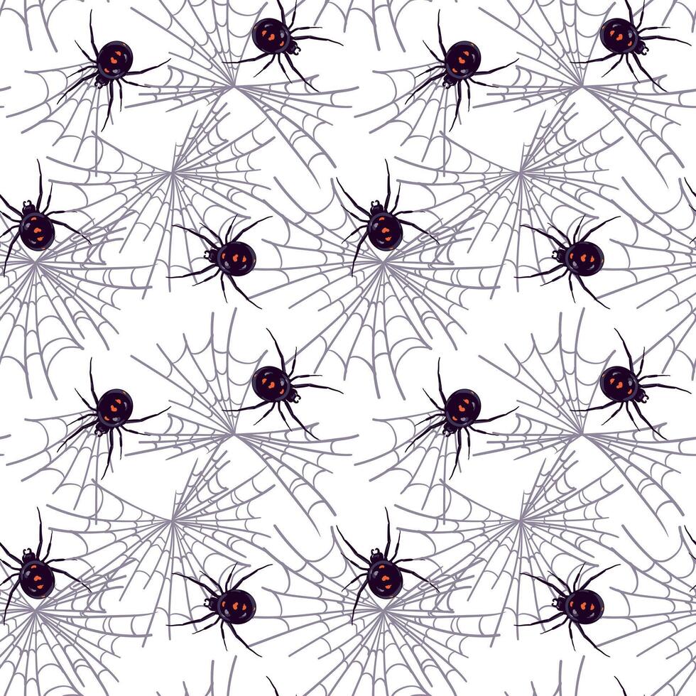 Spider black widow Latrodectus occidentalis hangs on a web. Black spider with red spots in flat style. Dangerous poisonous insect on a white background. seamless pattern for Halloween. Pro Vector