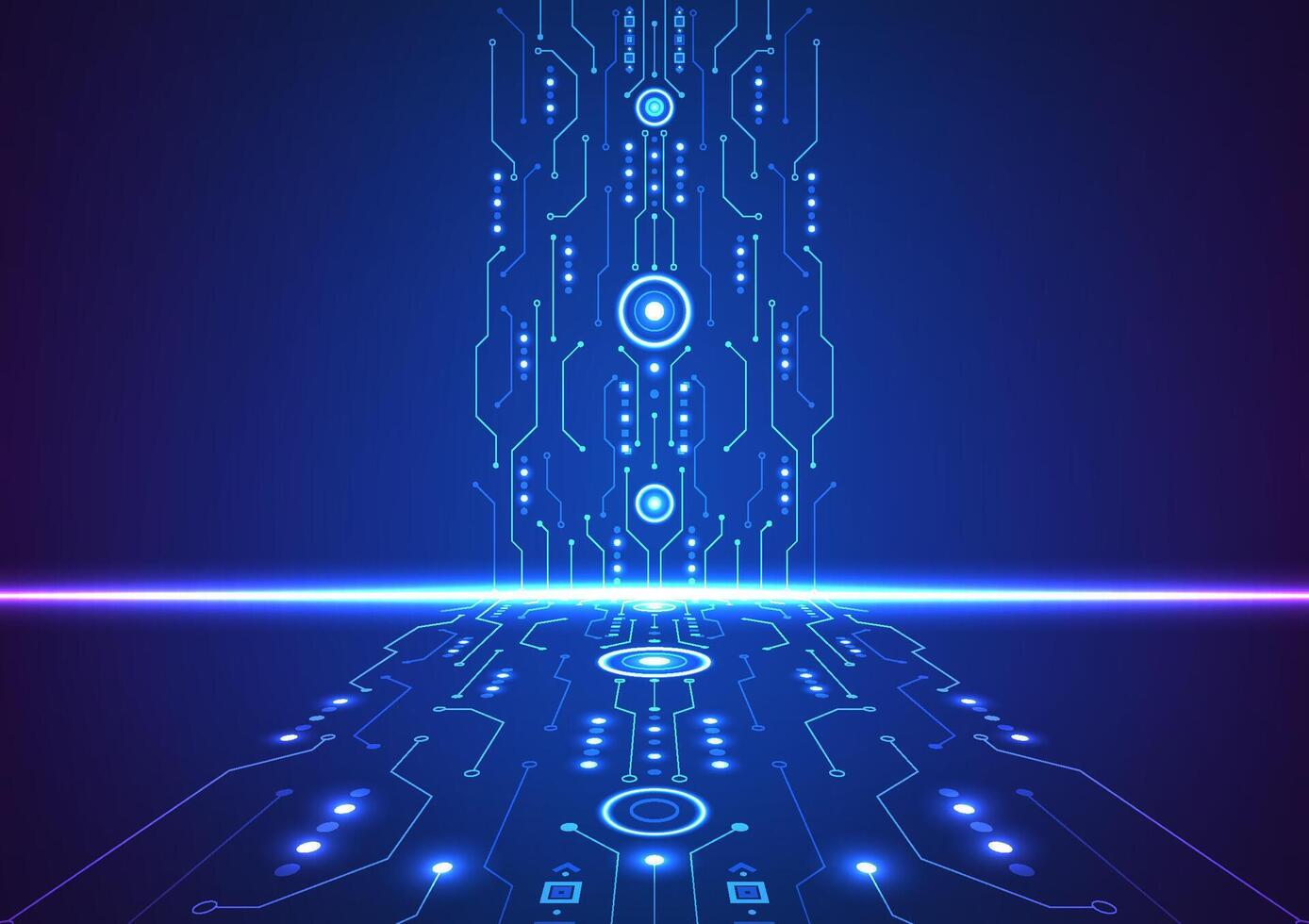 Futuristic circuit board and digital network background representing AI, cyber systems, and innovation. Pro Vector