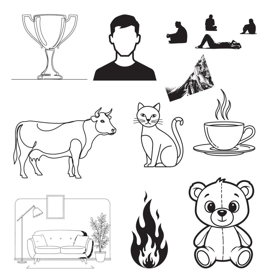 Collection of simple black and white illustrations depicting various everyday objects and concepts vector