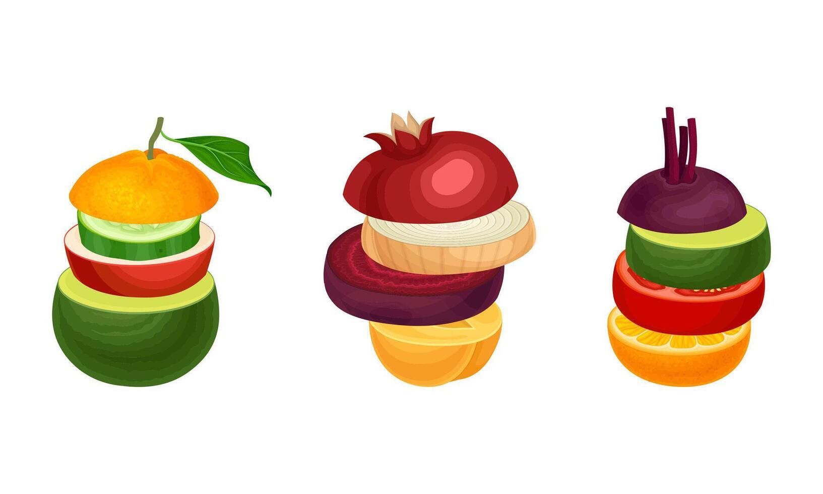 Set of sliced fruit and vegetables. Cucumber, apple, tomato, onion, pomegranate, apricot, beetroot round slices in stack illustration Pro Vector