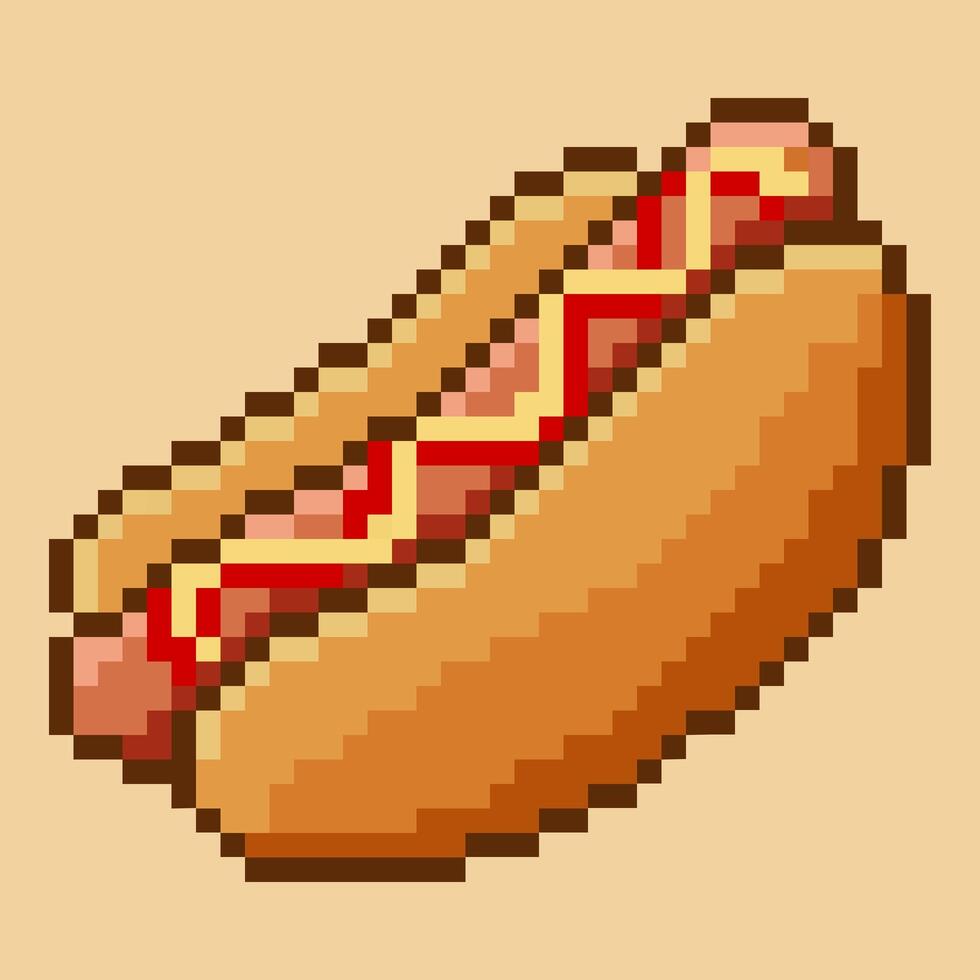 Classic pixel art hot dog, designed in an 8-bit style, this appetizing graphic features a sausage in a bun with a squiggle of yellow mustard. Pro Vector