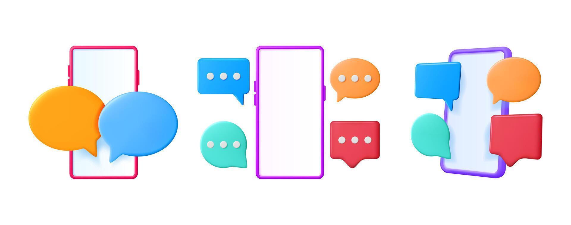 Set of 3d illustrations of smartphone frames and message bubbles. Mobile communication concept for chatting and social media. Pro Vector