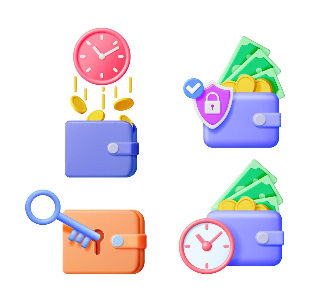 Set of 3d illustrations of wallet, money, clock, key, and lock, representing financial concepts for presentation Pro Vector