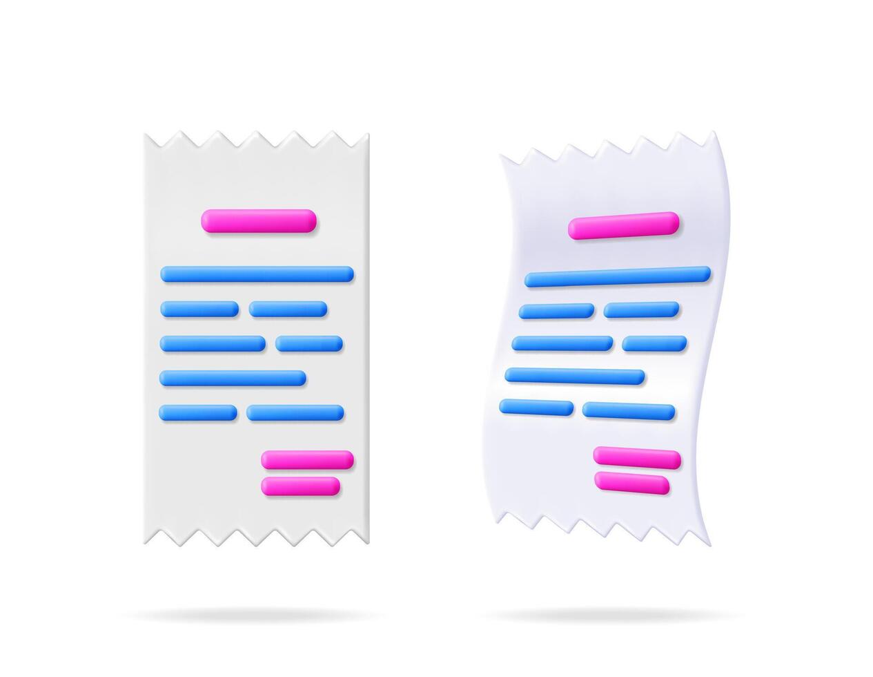 Two 3d realistic paper receipts with abstract text lines in blue and pink on white background for financial transaction. Pro Vector
