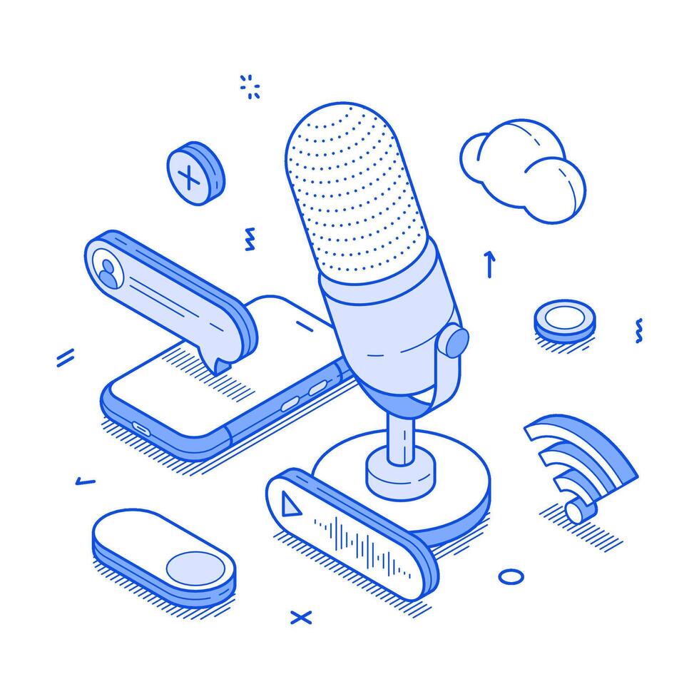 Podcast content creating audio radio internet interview minimalist isometric illustration Pro Vector