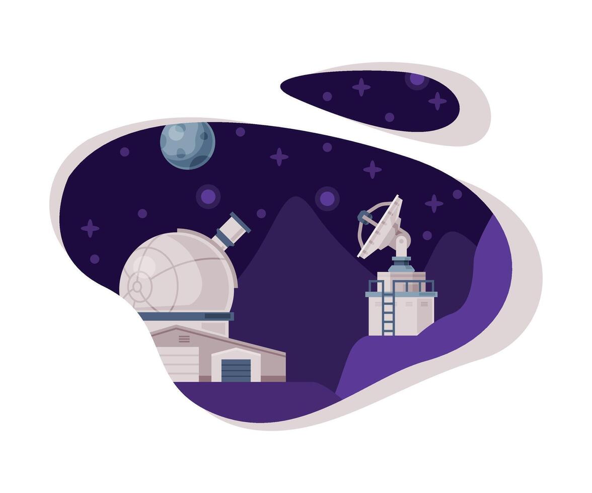 Observatory Building in Mountains, Explore and Observe Galaxy Technologies, Space Industry Exploration Concept Themed Illustration Background Pro Vector