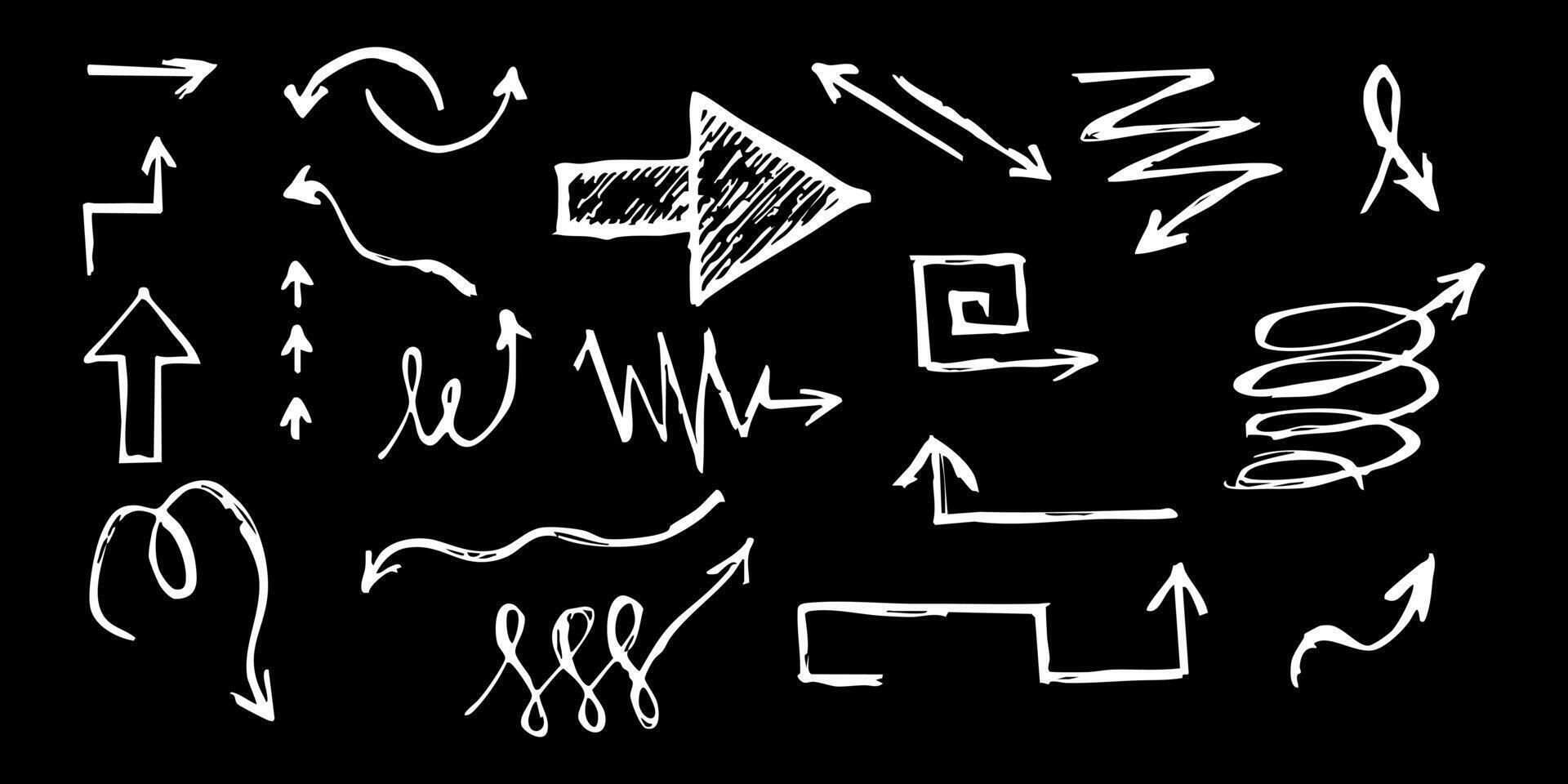 Crayon arrow sketches collection hand drawn doodle style pointers, curved lines, round swirls. Chaotic scribbling, artistic design elements set. Black grunge brush strokes isolated on white Pro Vector