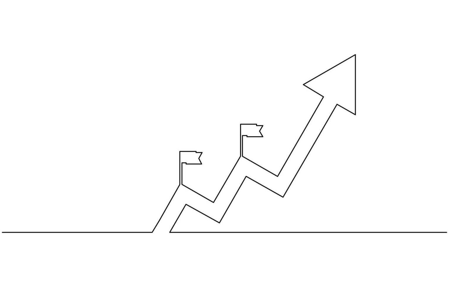 Continuous line drawing of graph icon business. Arrow up with a flag, Increasing business graph data. Growing graph in continuous one line drawing style, Editable outline. Pro Vector