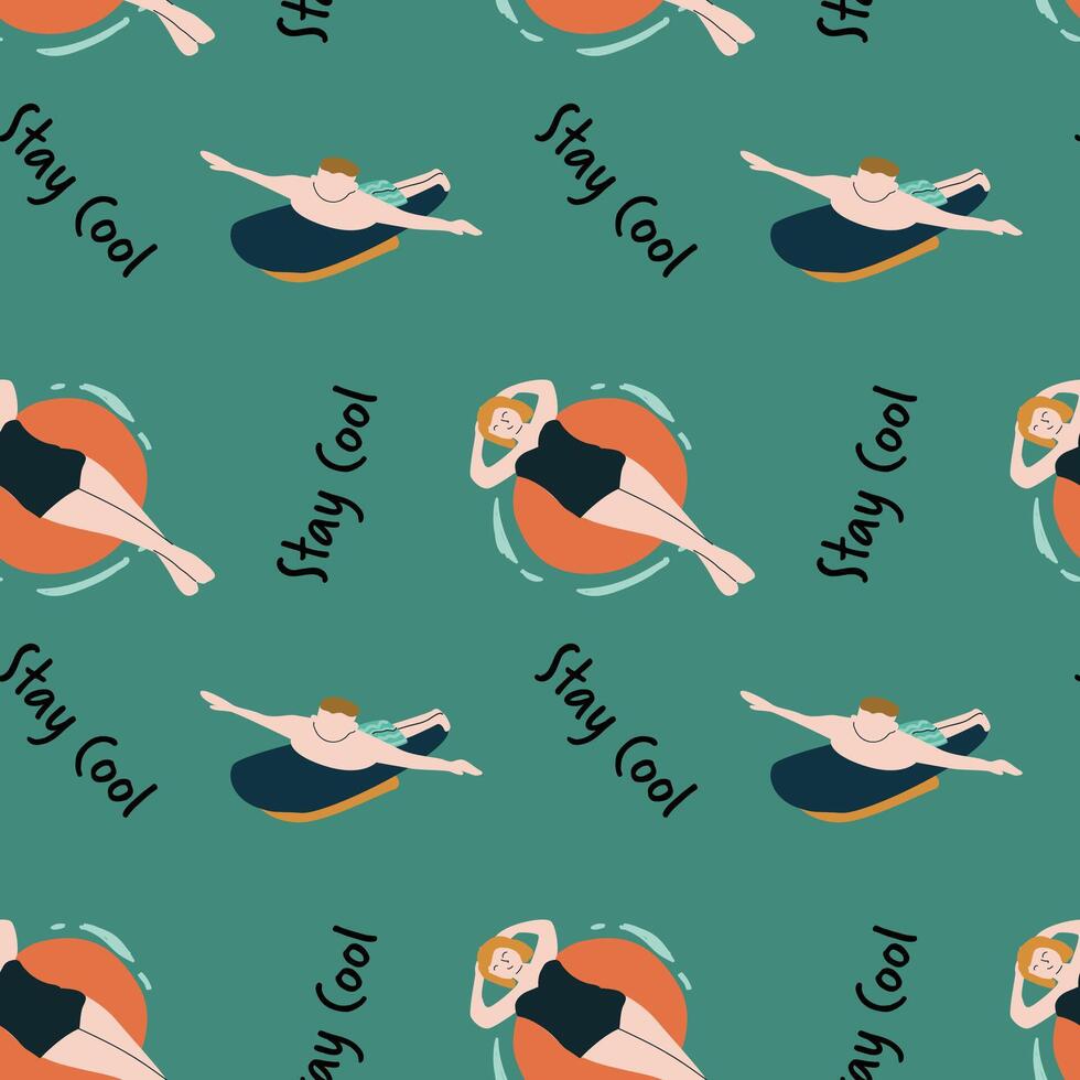 Seamless summer pattern with floating swimmer and 'stay cool' text Pro Vector