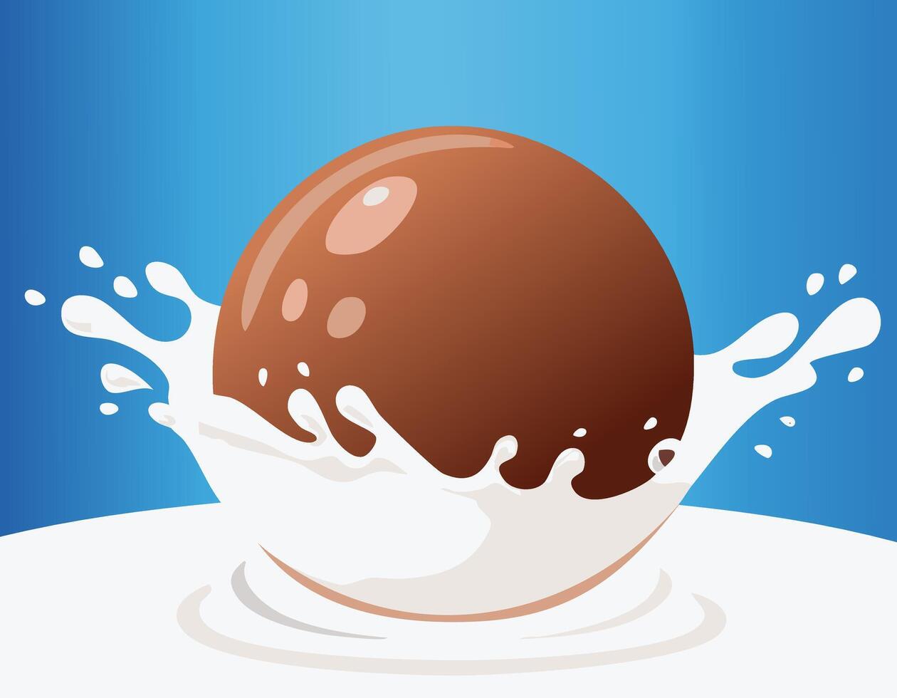 Chocolate ball splashing in milk with smooth curves and clean lines. A modern flat design with soft highlights and blue background. Simple and playful food art with space for text. Pro Vector