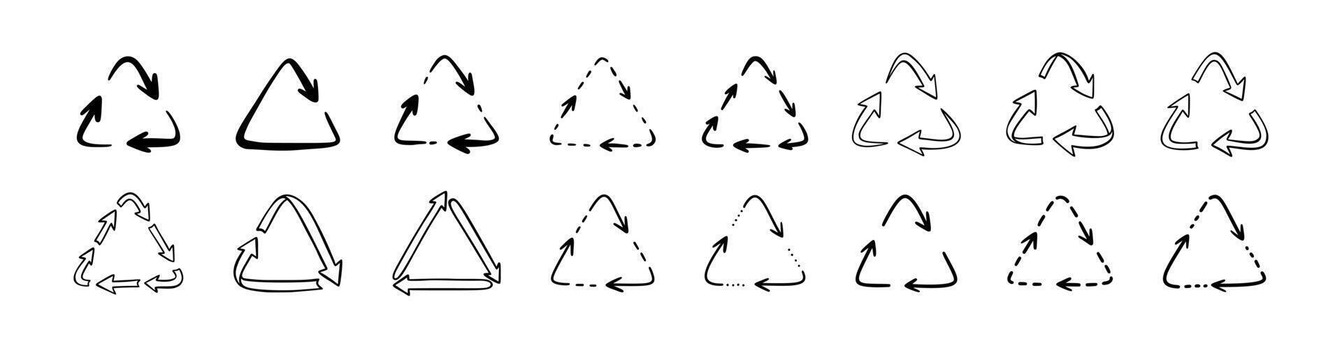 Set of doodle handwriting recycle plastic symbol. Icon sign of pp, pet, hdpe, ldpe, pvc. Eco-friendly concepts design element. Spinning, rotating, circulation arrow. Reuse pictogram drawing Pro Vector