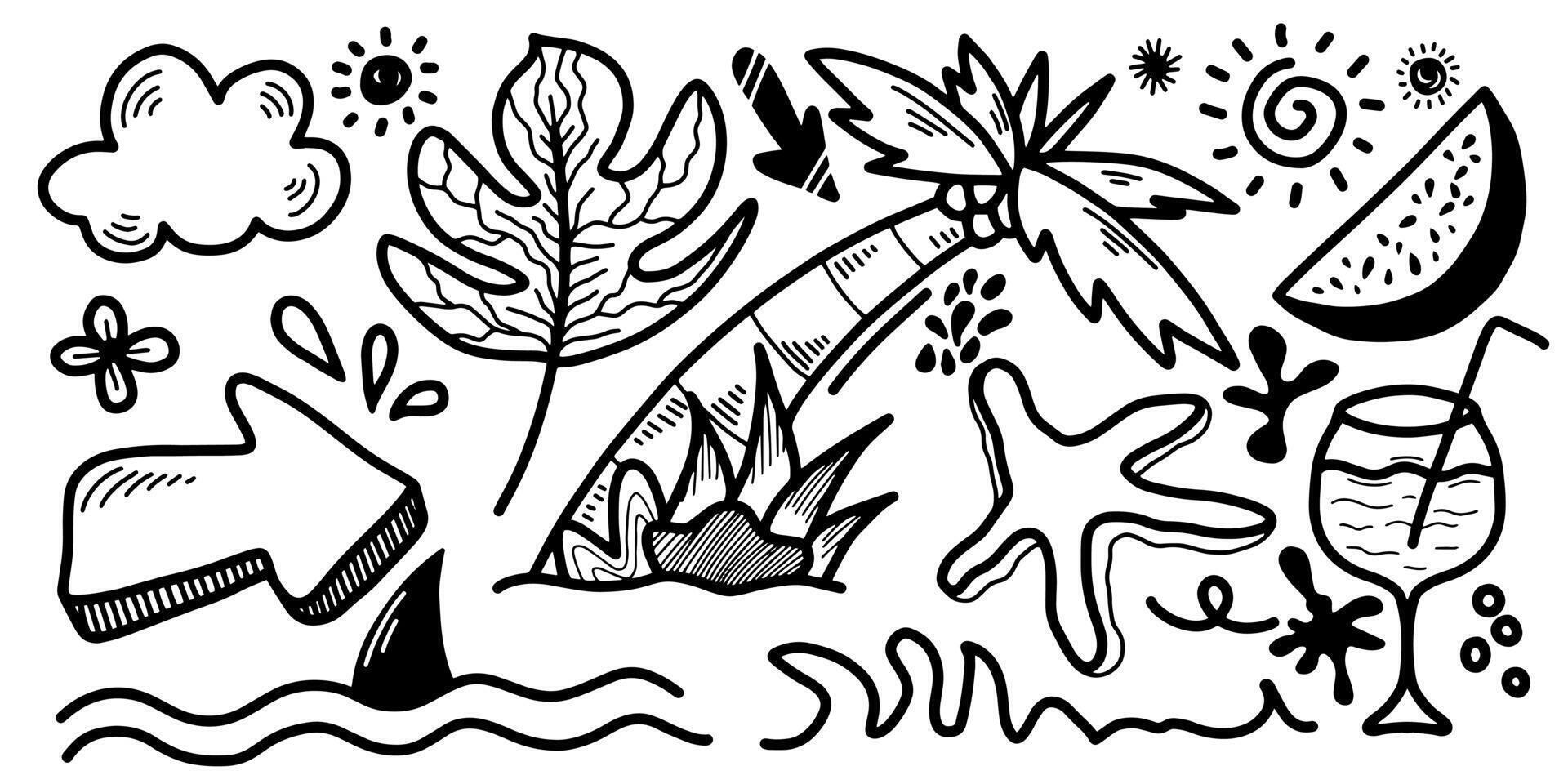 A collection of various items related to the beach and summer such as palm trees, starfish, ocean waves and more. Pro Vector