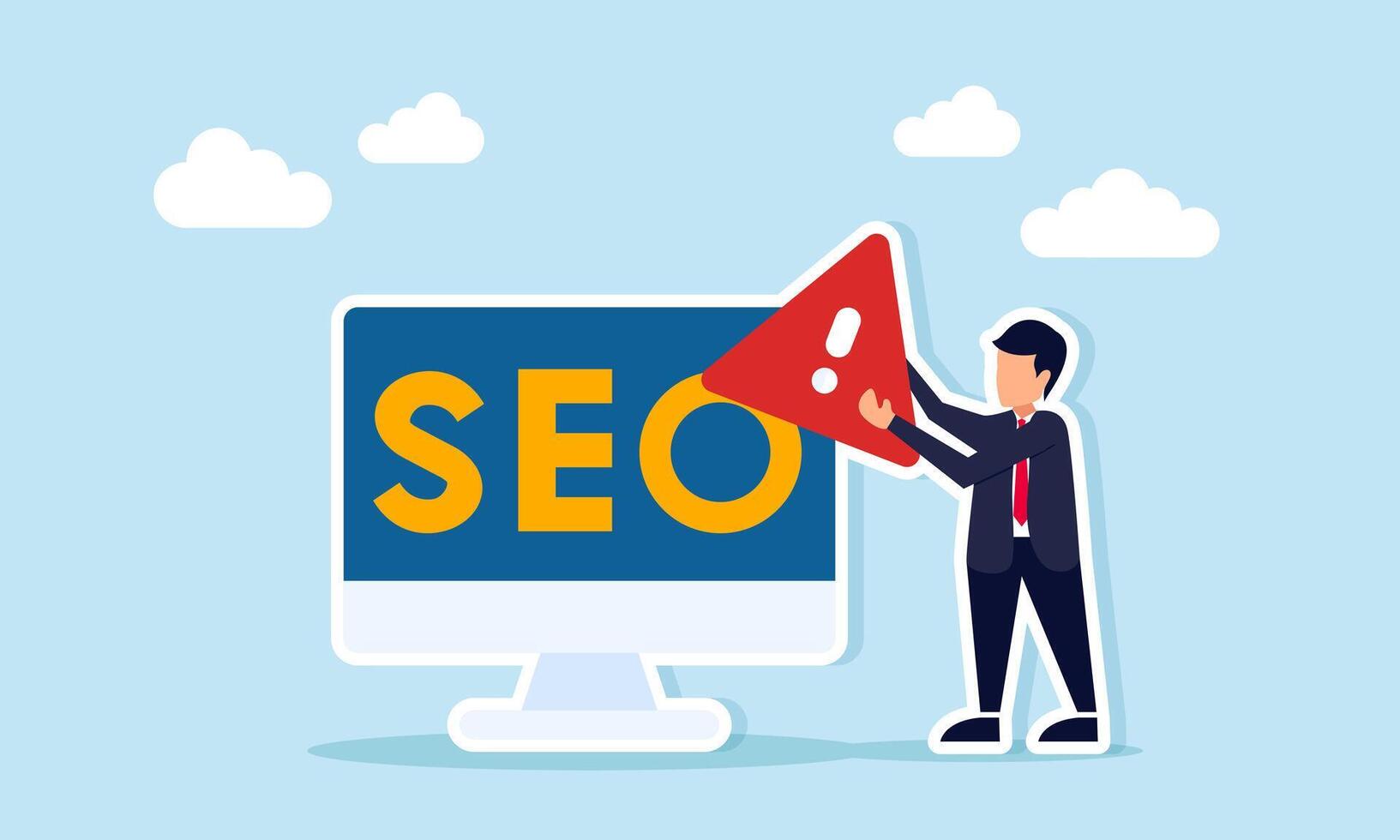 businessman holding warning sign next to monitor displaying SEO text illustration of the need for caution and accuracy in business keyword optimization Pro Vector