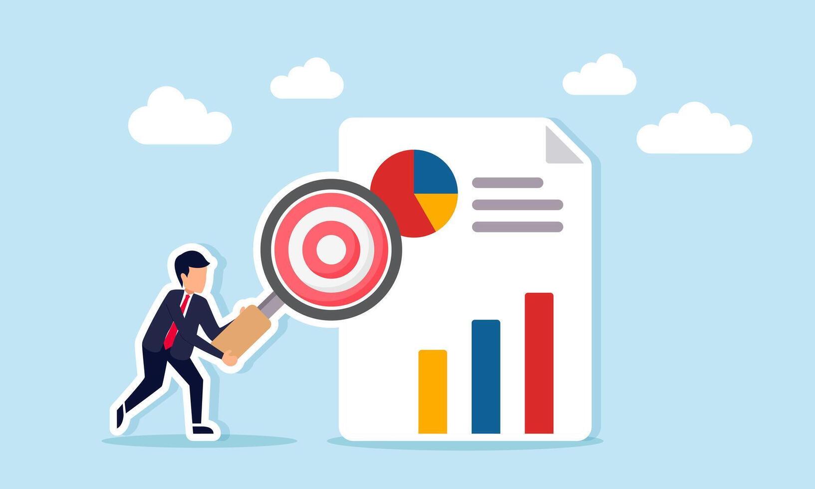 Businessman holding a magnifying glass with a target board sign examining a report with a chart illustration of business target performance analysis Pro Vector