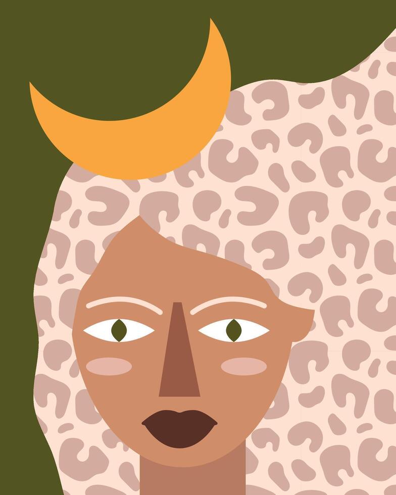 Stylized illustration of a face with a geometric design, featuring a crescent moon and abstract patterns. Earthy tones and bold shapes create a modern artistic expression. Pro Vector