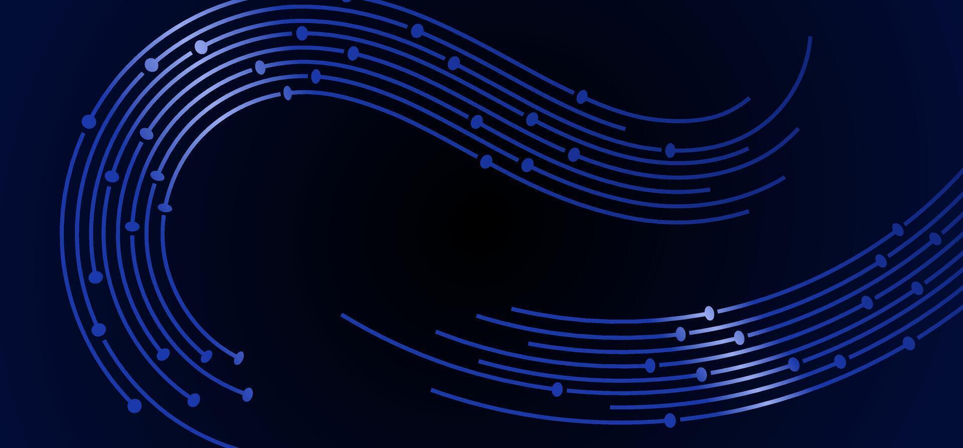 Flowing blue lines with dots connect to a central black void on a dark gradient background Pro Vector