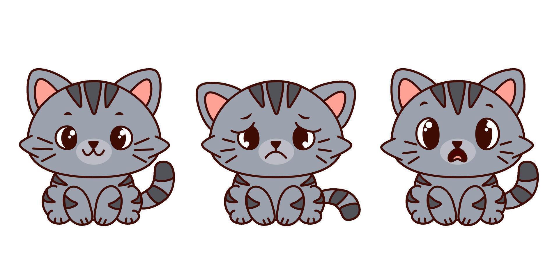 Three cute cartoon gray tabby cats with different facial expressions. happy, sad, and surprised. Each cat has distinct features and a playful design. Pro Vector