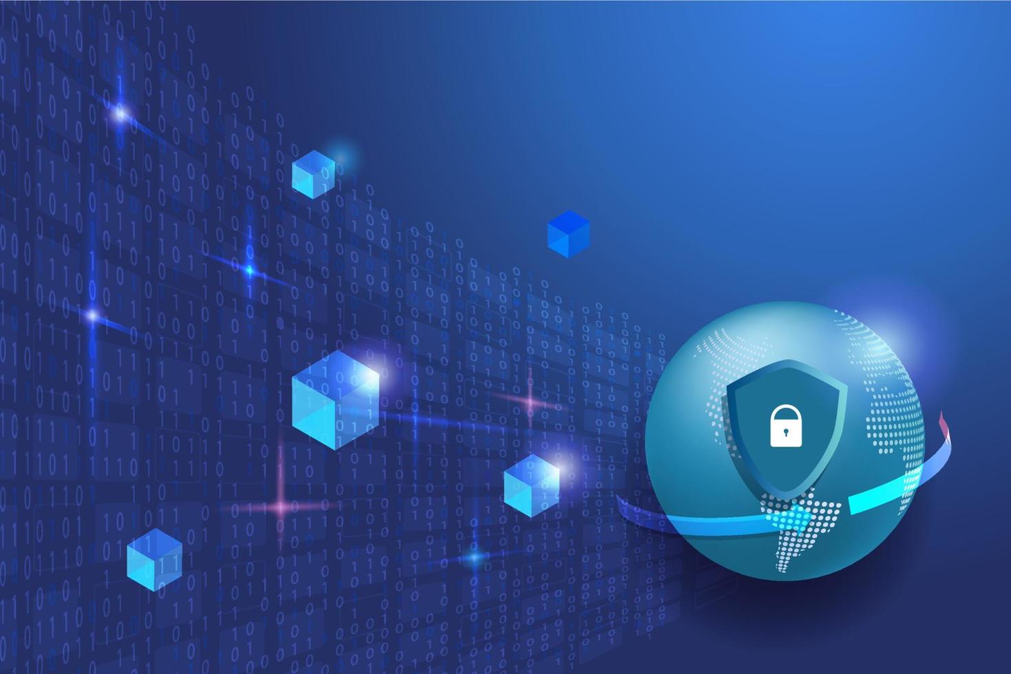 Cyber security network with block chain technology, secure data protection from digital service provider. Shield and padlock with safety network connecting on globe. Pro Vector