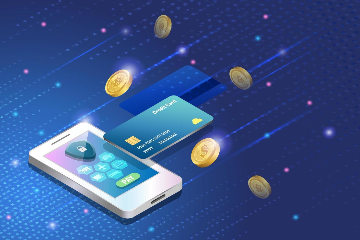 Smart payment, credit card online payment with crypto currency coins, secure transaction on smart phone. Financial security in digital online and global network connecting, cyber security technology. Pro Vector