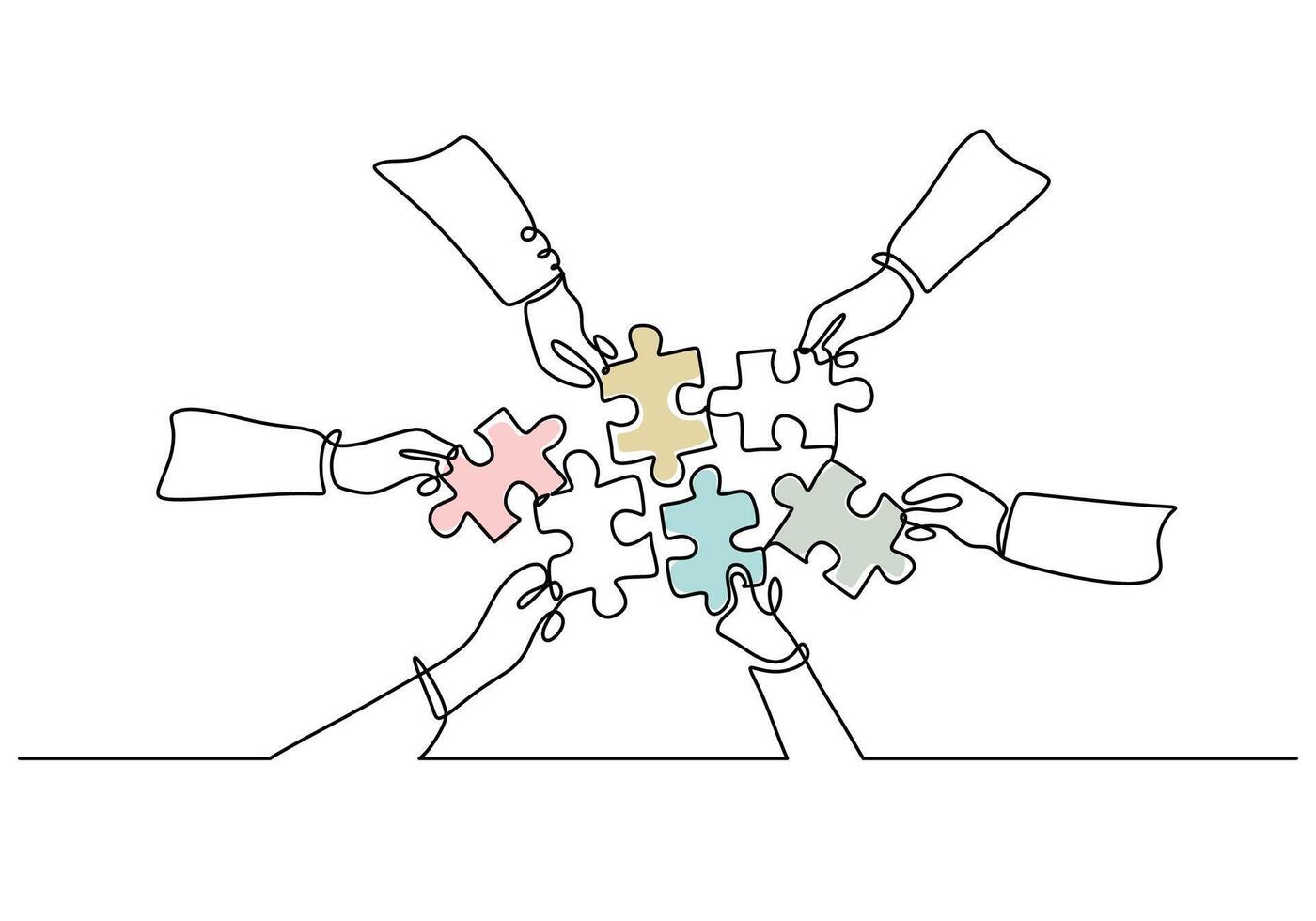 Hands with Puzzle Pieces One Line Drawing for Teamwork Connection Pro Vector