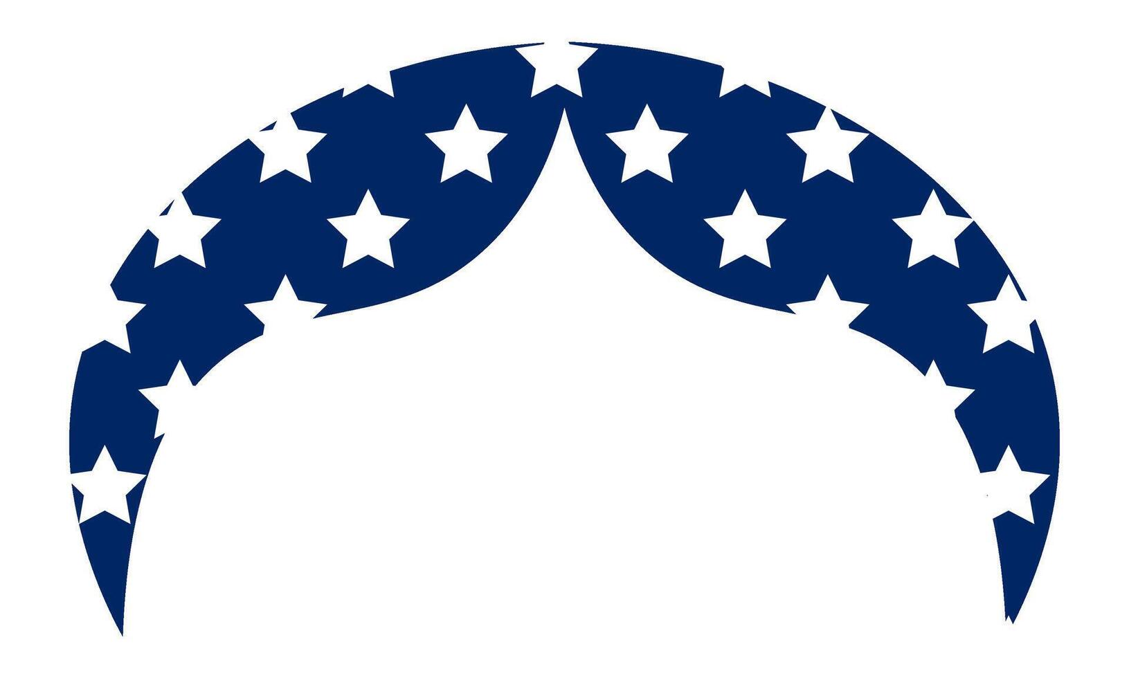 Two symmetrical blue wavy shapes, adorned with white five pointed stars, mirror each other, forming an elegant arch against a clean white background, creating a striking visual composition Pro Vector