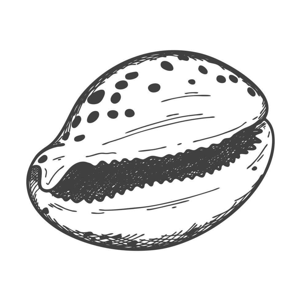 Hand-drawn seashells. An empty, closed, flat, oval solid shell of a mollusc or snail. Sketch style, engraved drawing. Black and white illustration isolated on a white background. Pro Vector