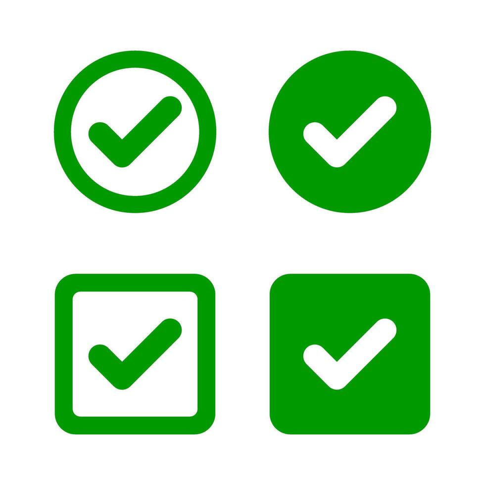 Green Check mark icon illustration in two variants. Approved, yes, confirm, done, vote, accept, tick, select, check box, and questionnaire green check mark button set circle and round shapes. Pro Vector