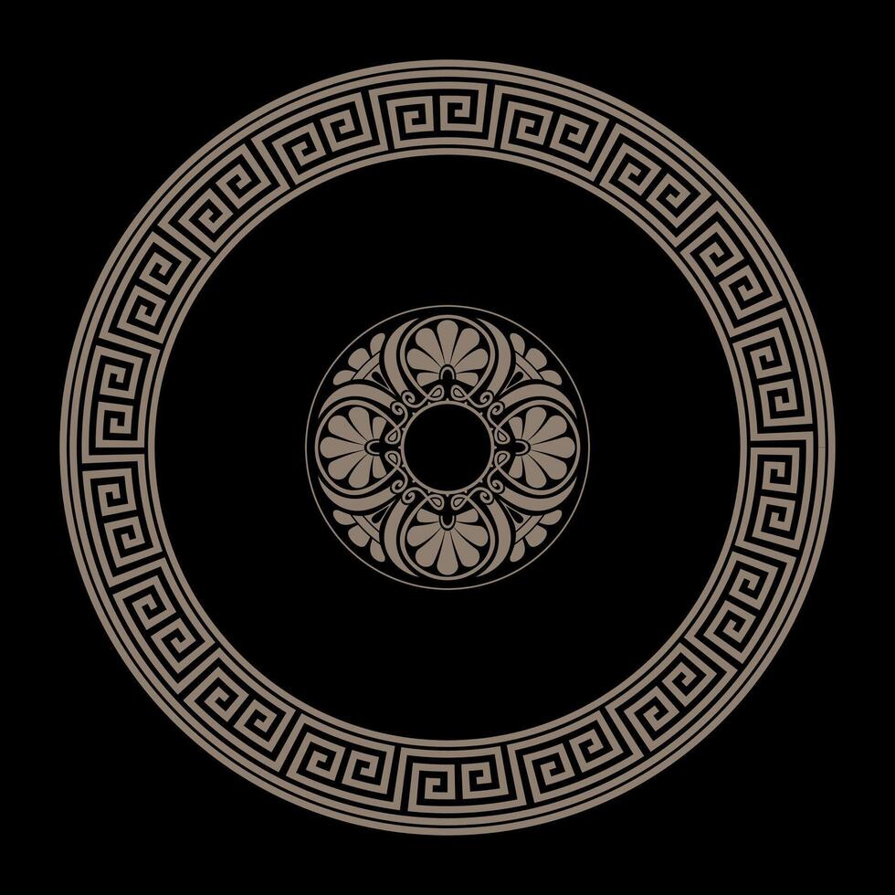 Greek golden key round frame on black background with a pattern in the center of the plate. Patterns of Ancient Greece, ancient Rome Empire. Greek key, meander pattern.Template for design Pro Vector