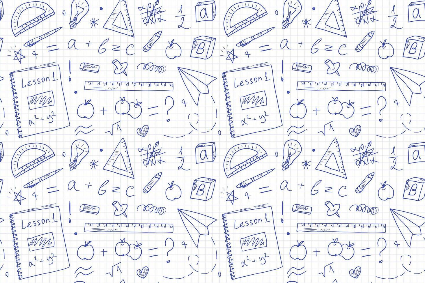School supplies, a seamless pattern drawn with a pen on a checkered background. The concept of Education and science. A Back to School print for Knowledge Day with outline drawings on a notebook sheet Pro Vector