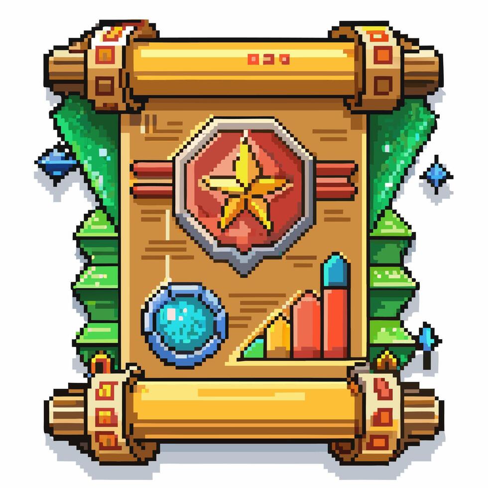 Retro Pixel Art Scroll with Star Badge, Graphs, and Gems, Gaming Icon, Classic Game Design Free Vector