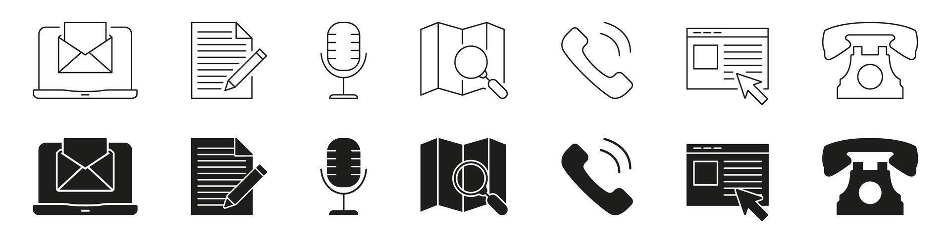 Communication And Media Tools Line And Solid Icon Set. Email, Document, Microphone, Map, Phone, And Webpage Interaction Symbol Collection. Digital Communication. Isolated Illustration Pro Vector