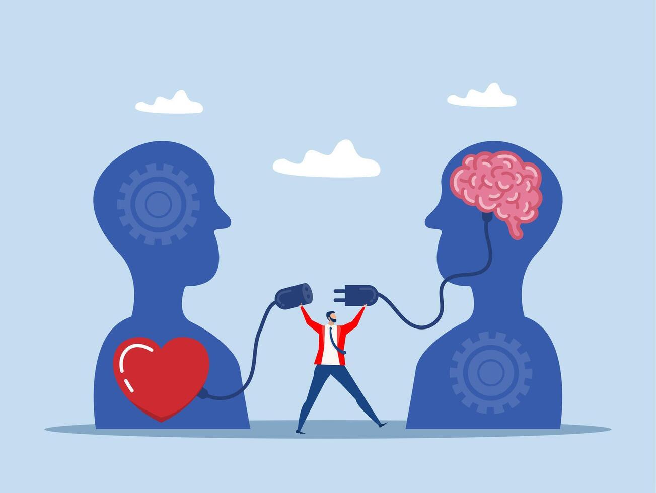 man connect heart feeling with logical thinking brain.Emotional Intelligence, EI or control feeling and emotion with logical thinking brain heart and brain connection,Emotional Intelligence concept Pro Vector