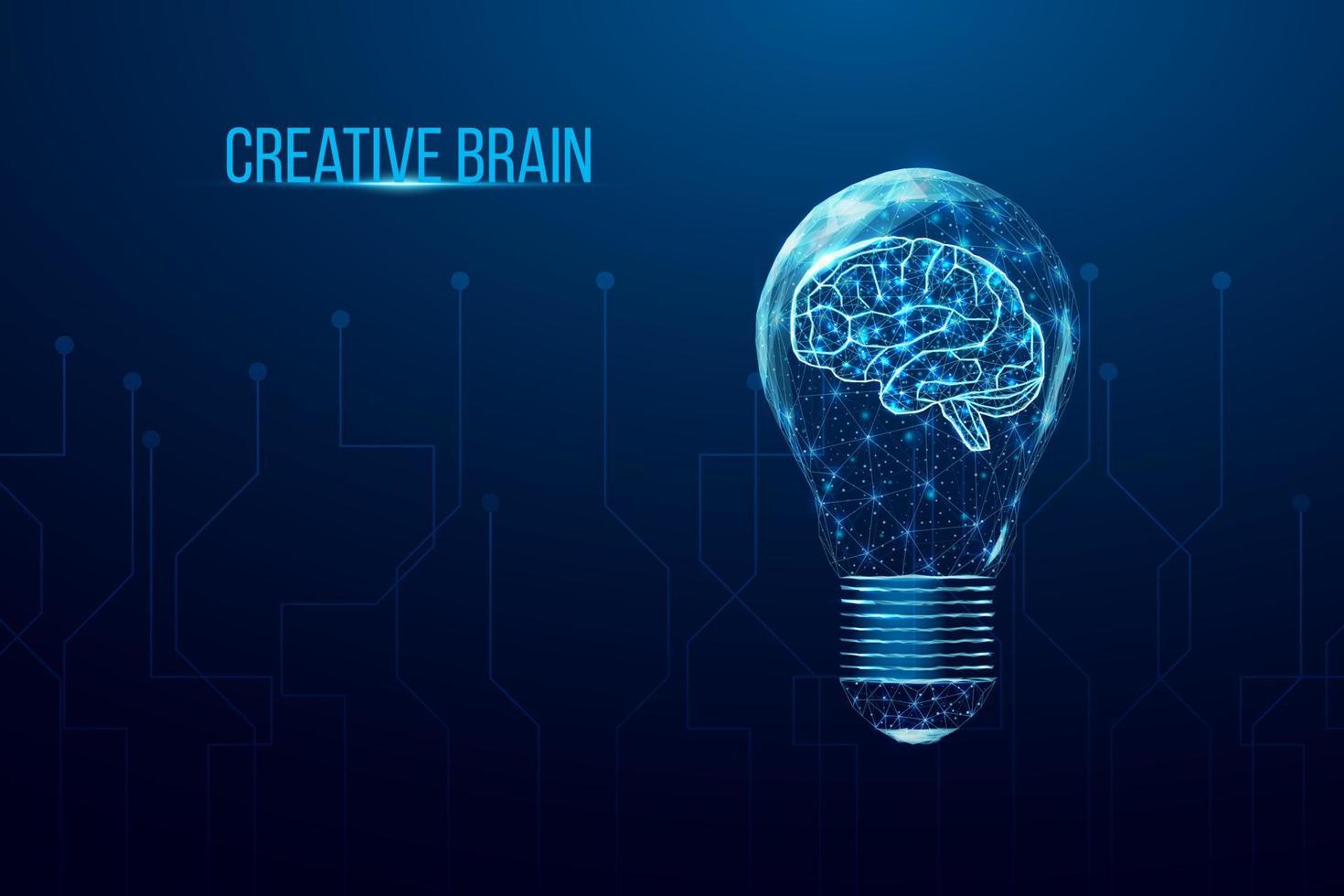 Wireframe polygonal human brain in a lightbulb. Business idea, brainstorming concept with glowing low poly bulb. Futuristic modern abstract. Isolated on dark blue background. Vector illustration. Pro Vector