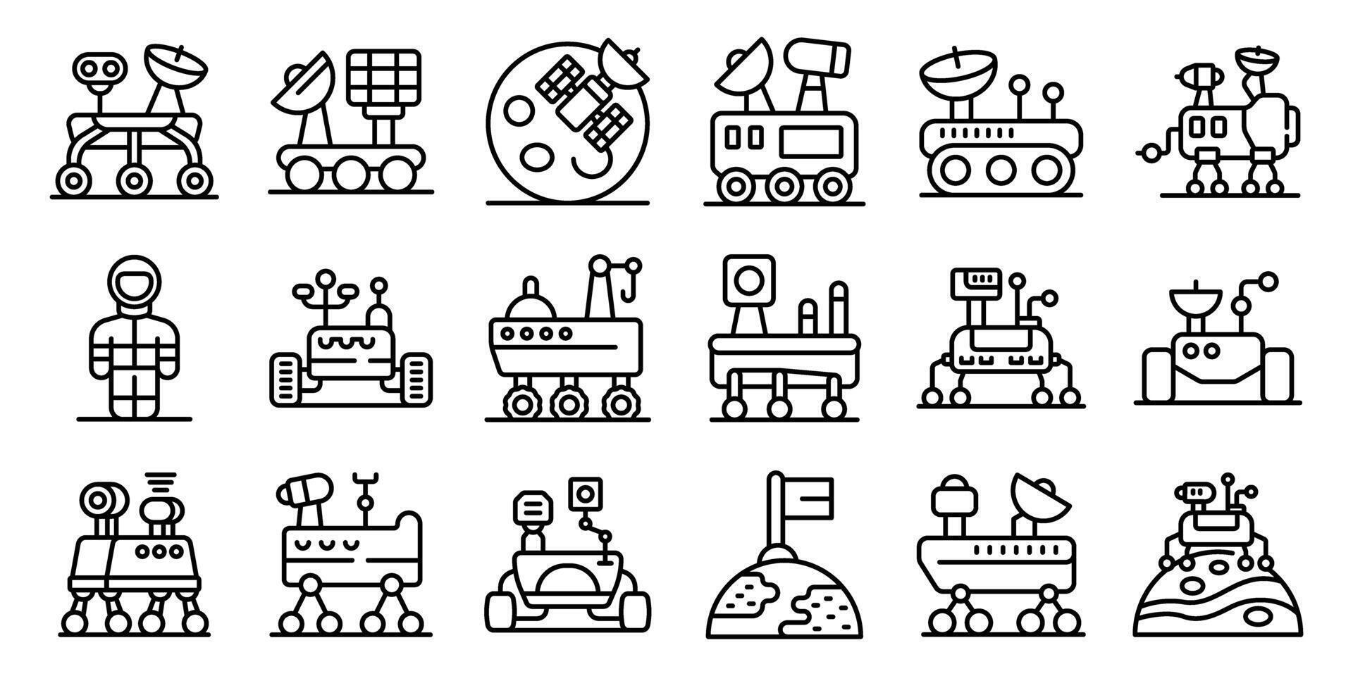 Mars rover icons set. Mars rovers exploring martian surface, autonomous space vehicles, and astronaut in spacesuit Pro Vector