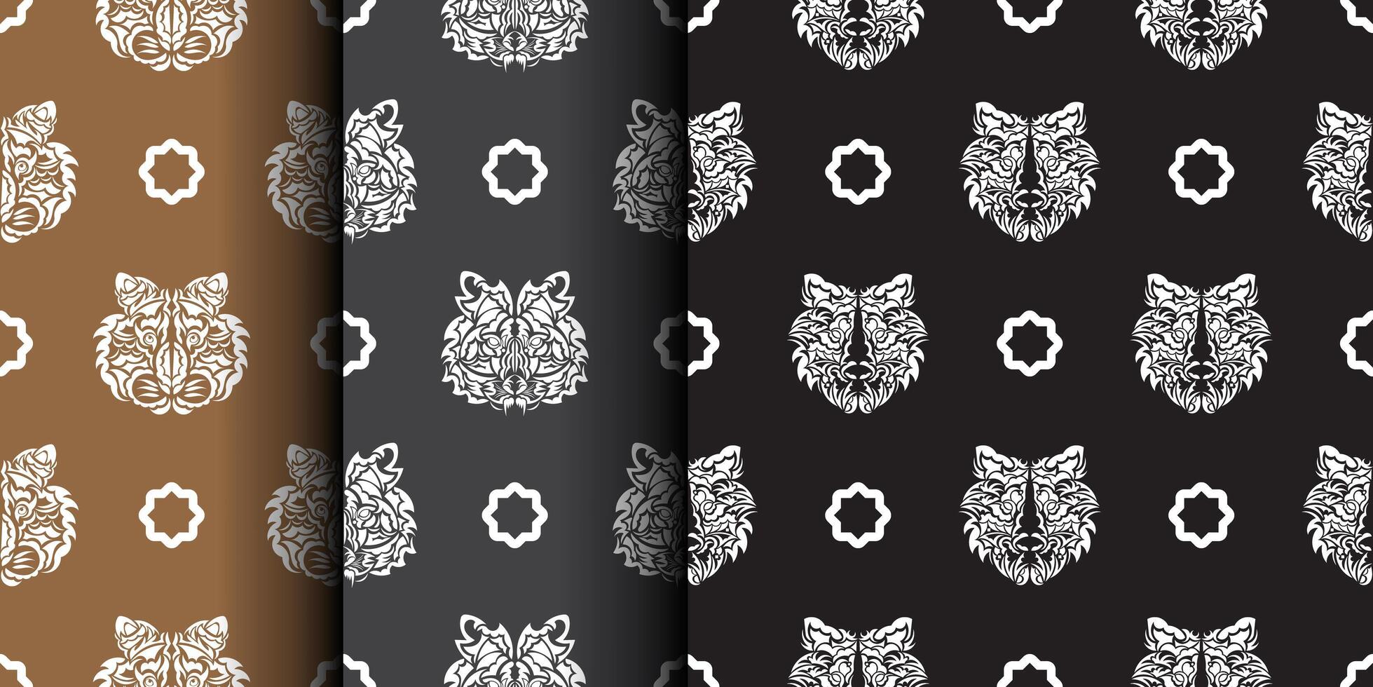 Set Seamless pattern with tiger face in boho style. Polynesian style tiger face. Good for backgrounds and prints. Vector illustration. Pro Vector