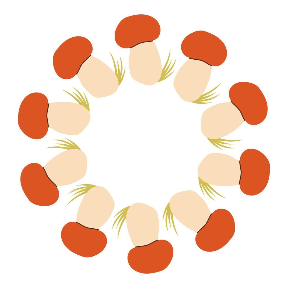 Red head mushroom circle frame. Round border made of fall mushrooms. The mushrooms have different shapes and are arranged in a circle. flat isolated on white background. Pro Vector