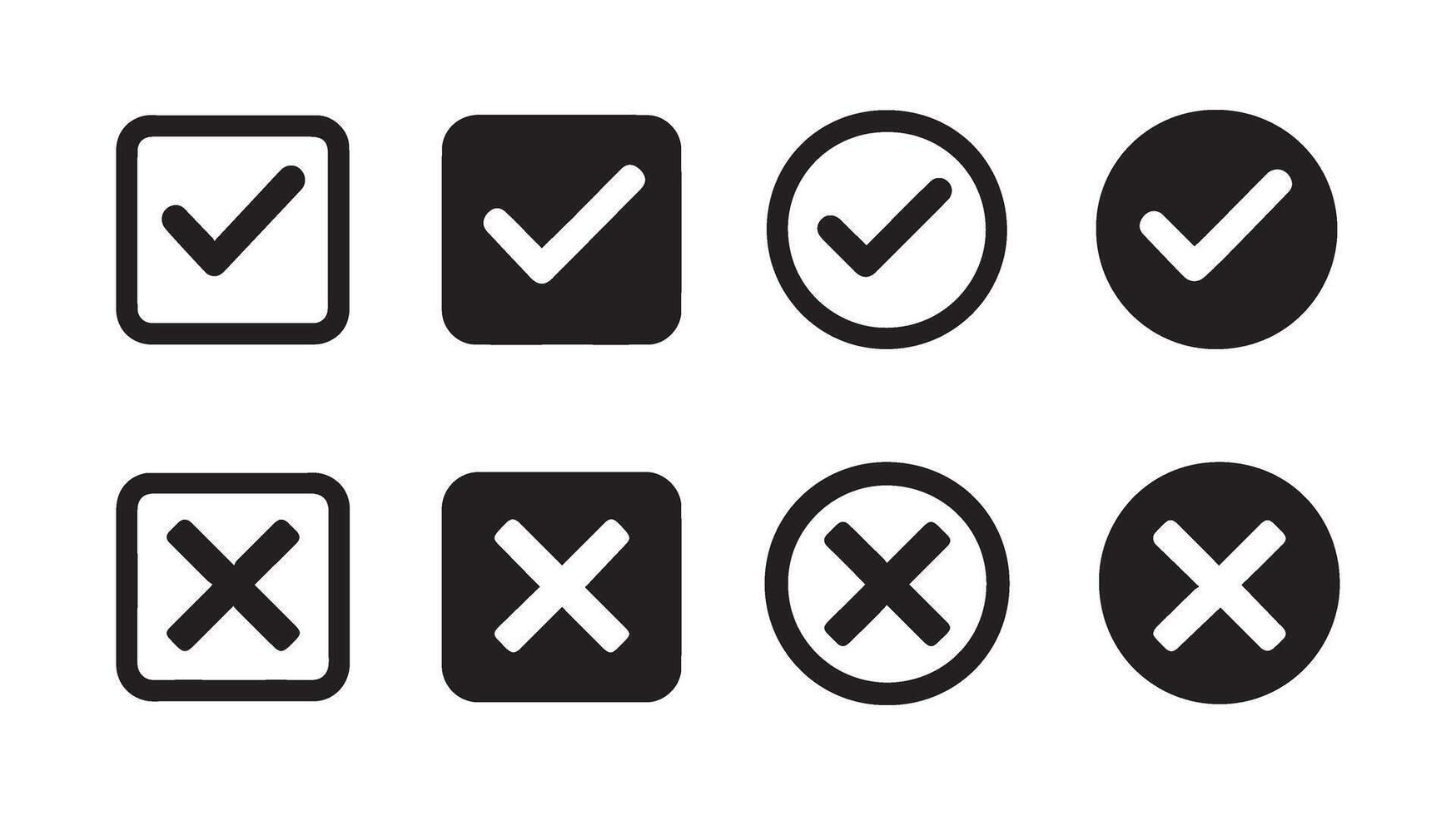 Black and White Check Mark and Cross Icons Set Square and Round Shapes Graphic Design Elements Pro Vector