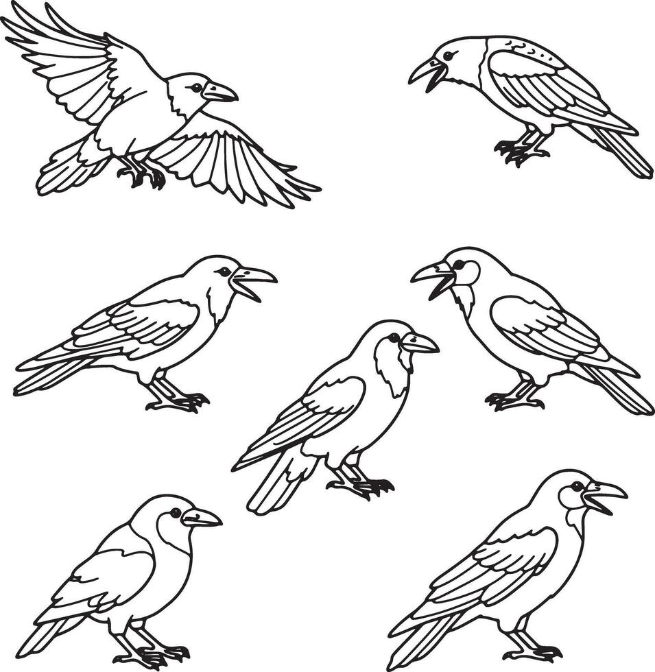 Six Elegant Line Drawings of Crows in Various Poses, Displaying Grace and Mystery on a White Background Pro Vector
