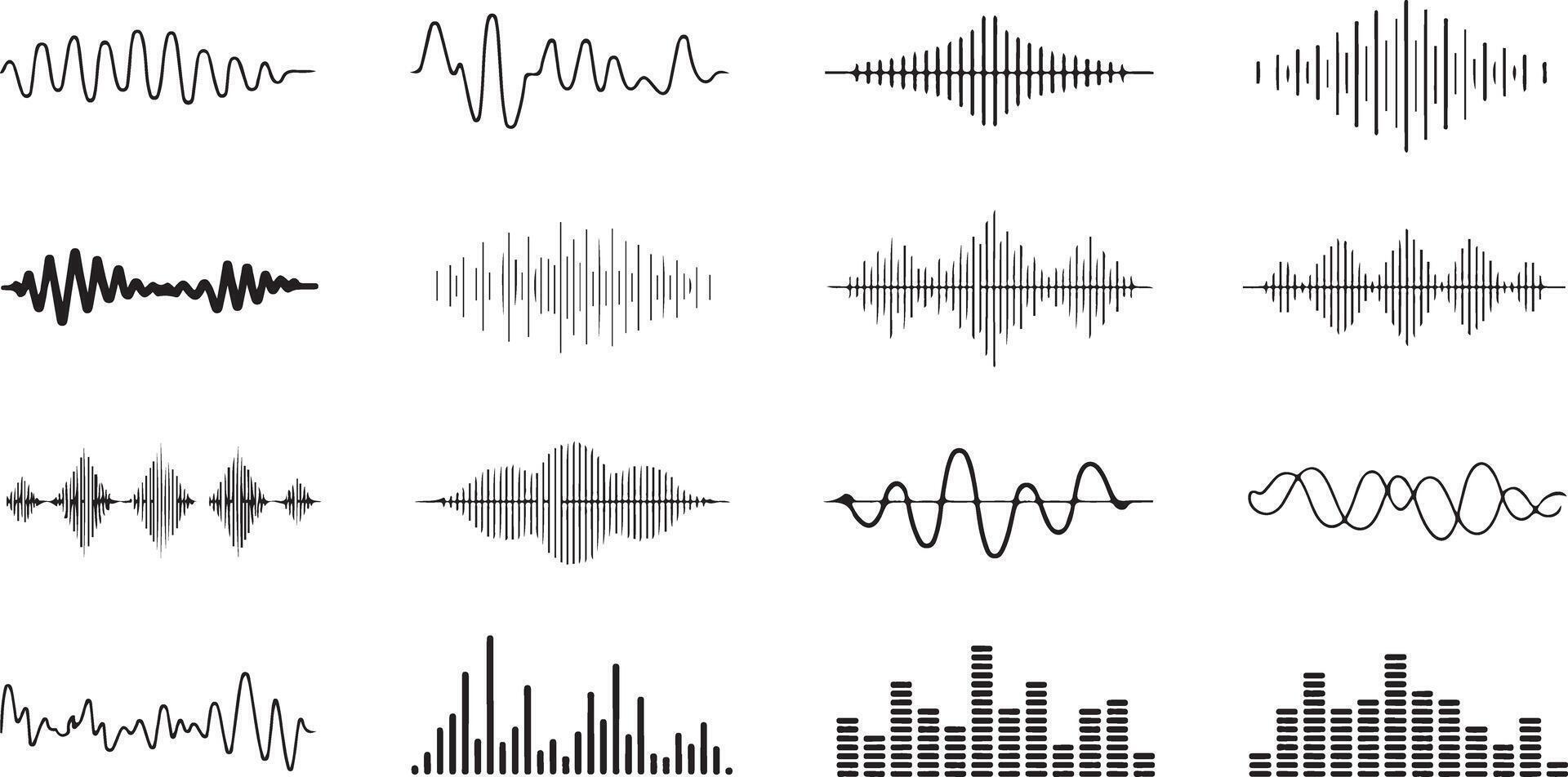 Twelve Black and White Traced Sound Waveforms and Audio Spectrum Visualizations Isolated on White Background Graphic Design Elements Pro Vector